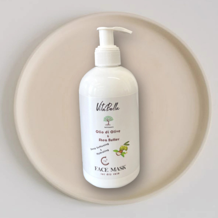 ماسک صورت ویتابلا که با میزان قابل ملاحظه ای از شی باتر و روغن زیتون به منظور مراقبت شدید، نرمی و حفاظت از پوست خشک فرموله شده است.